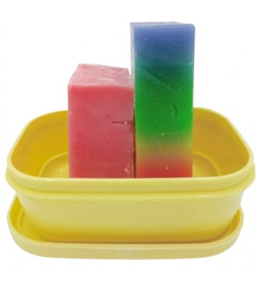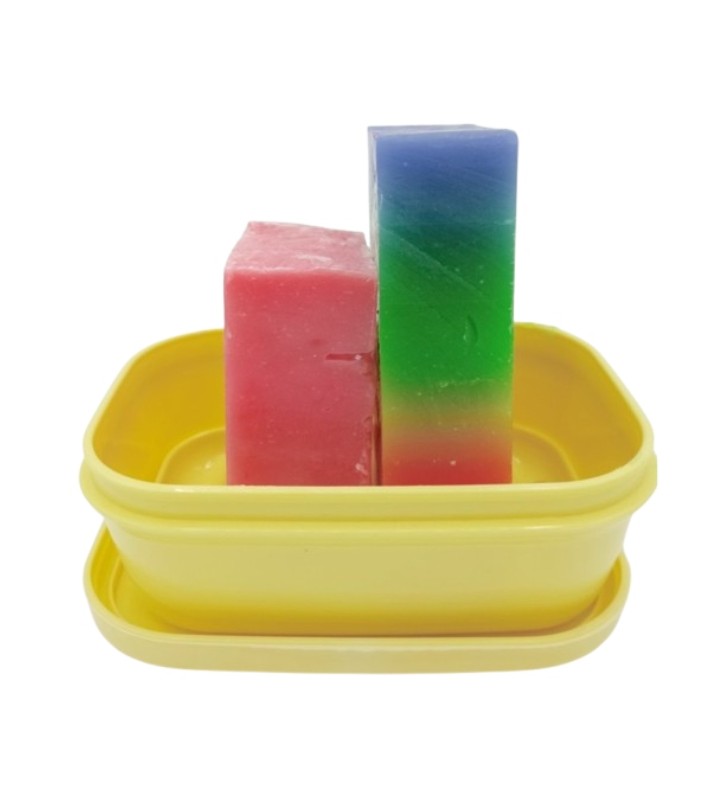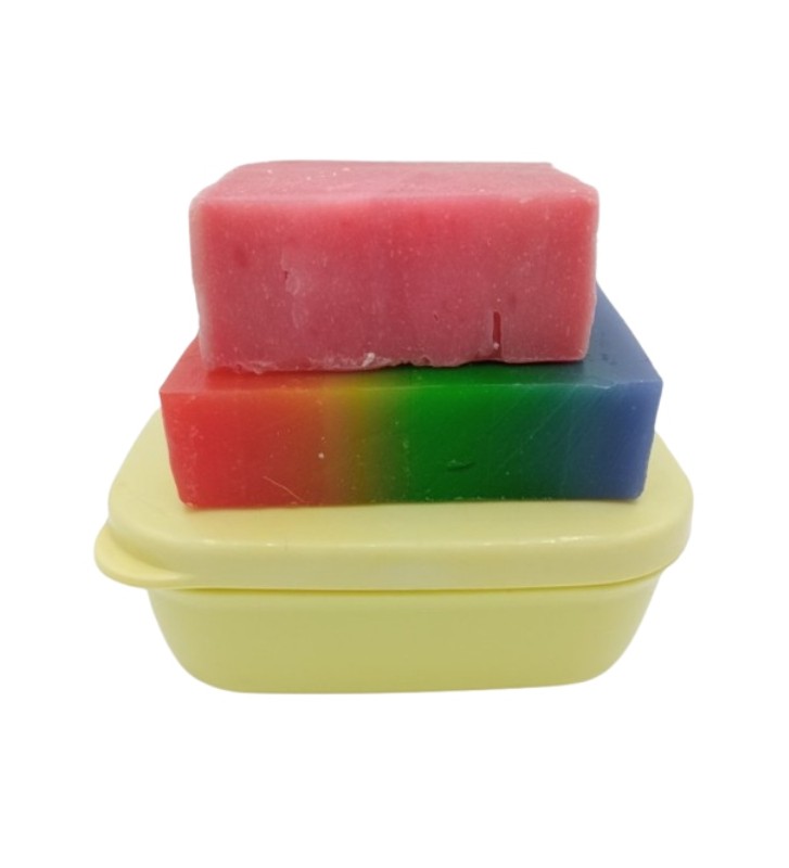 Compuesto por una jabonera de viaje con tapa y rejilla con un Jabón de fresa (120 gr.) y un Jabón Arco Iris (120gr.) Dispuesto para regalo.