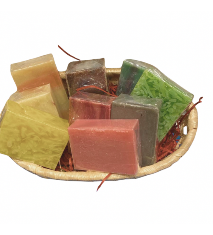 Selección de los 9 jabones más vendidos de 55/60 gr. cada uno, dispuesto en una cesta de mimbre para regalo.